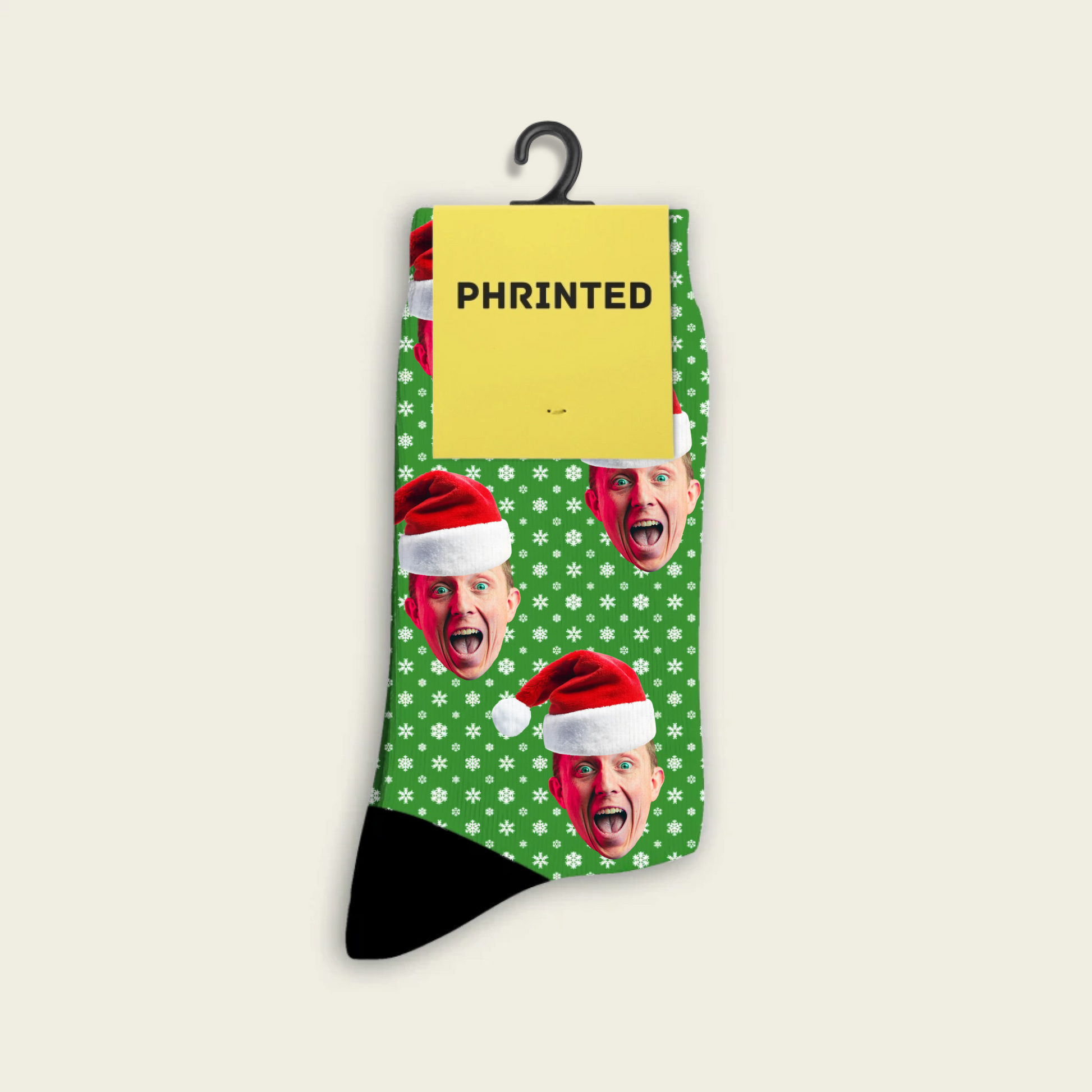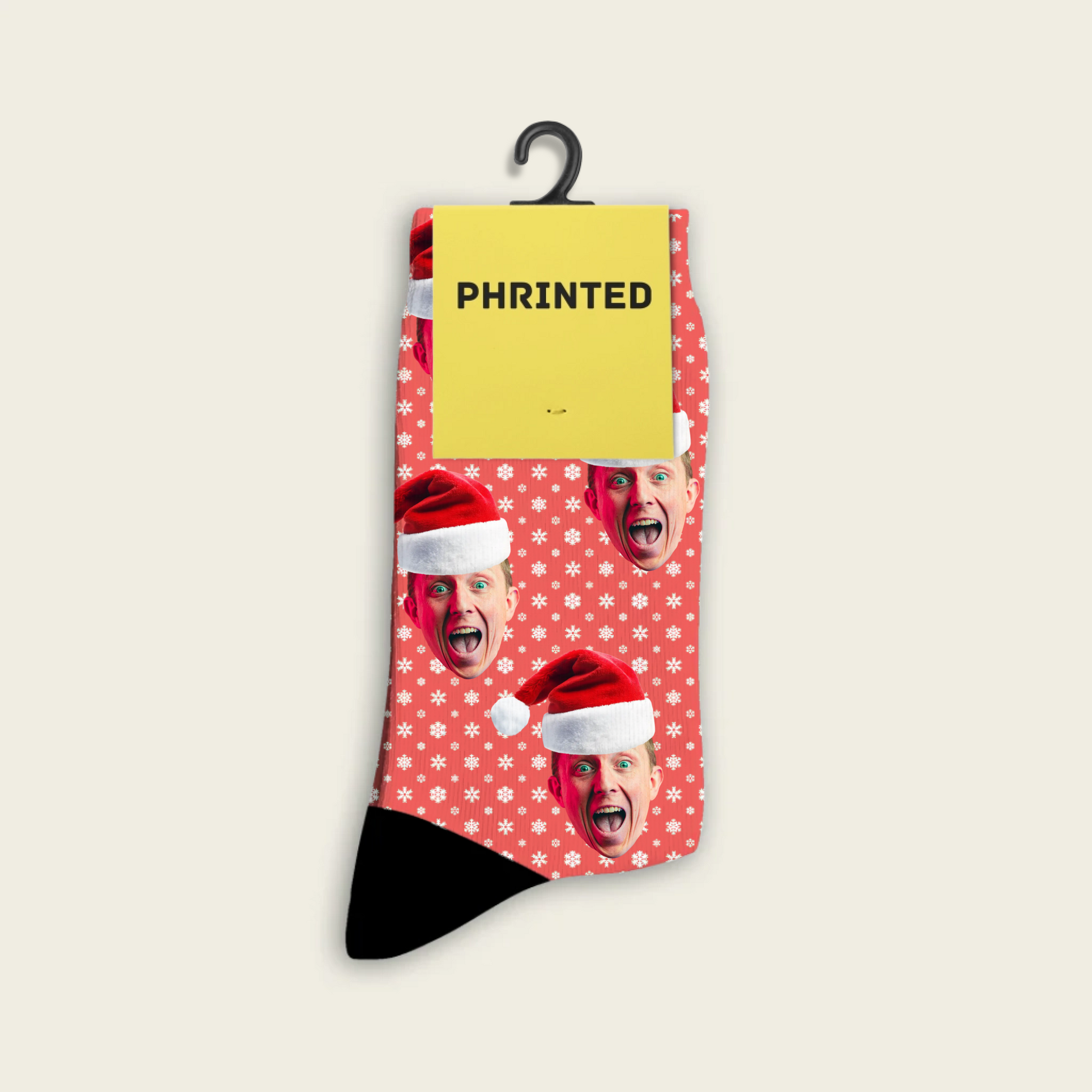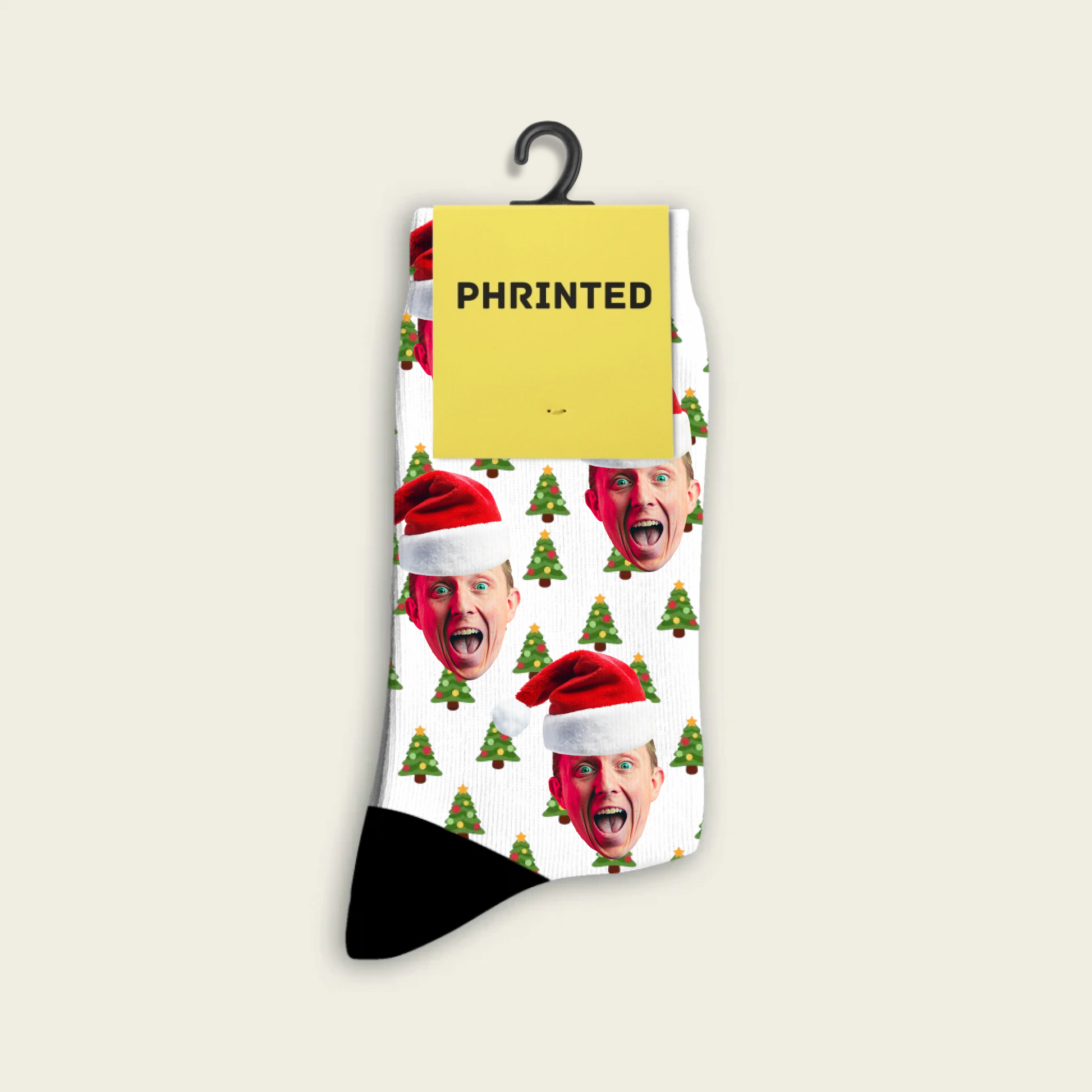 Just upload a photo — our designers cut out the face, add a Santa hat, and print it all over your socks. 🎅